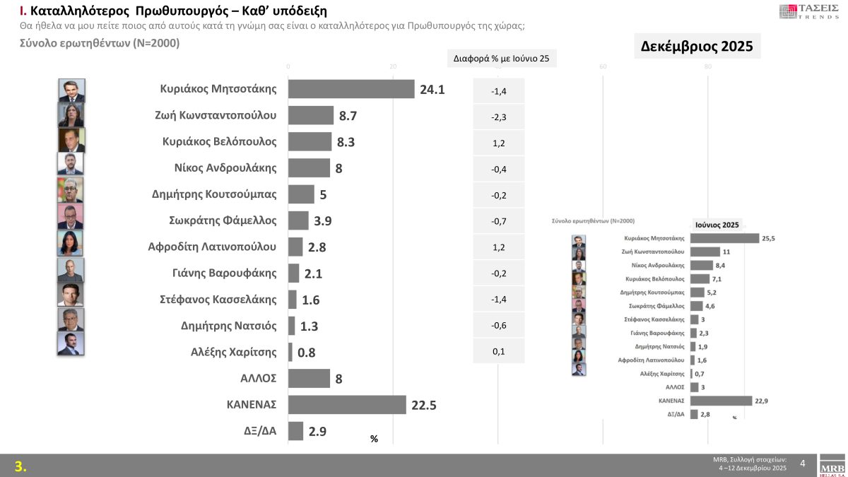 Στον πίνακα που ακολουθεί δείτε πώς διαμορφώνεται στις τάσεις Δεκεμβρίου 2025 της MRB η δημοτικότητα των πολιτικών αρχηγών: