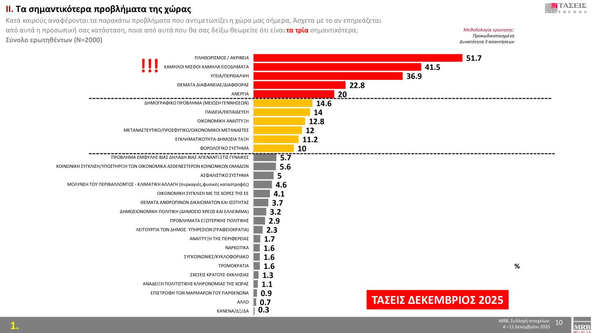 Οι πολίτες θεωρούν ότι τα τρία σημαντικότερα προβλήματα της χώρας είναι: πληθωρισμός/ακρίβεια με 51.7 %, χαμηλοί μισθοί/χαμηλά εισοδήματα με 41.5 % και υγεία/περίθαλψη με 36.9 %.