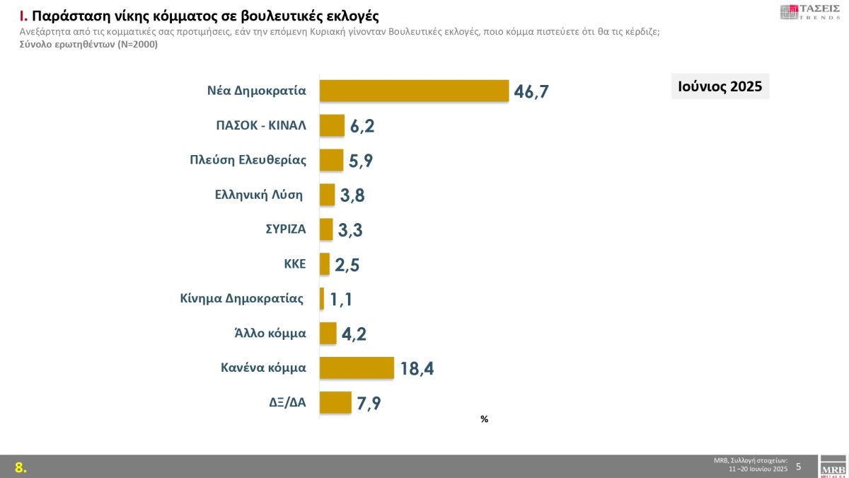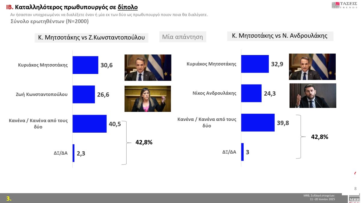 Στον πίνακα που ακολουθεί δείτε πώς διαμορφώνεται στις τάσεις Ιουνίου 2025 της MRB η δημοτικότητα των πολιτικών αρχηγών:
