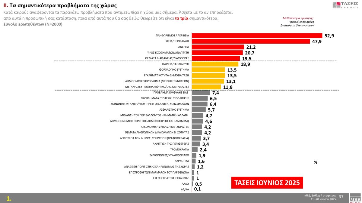 Οι πολίτες θεωρούν ότι τα τρία σημαντικότερα προβλήματα της χώρας είναι: Πληθωρισμός/ακρίβεια. με 52,9 %, υγεία/περίθαλψη με 47,9 % και ανεργία με 21,2 %.