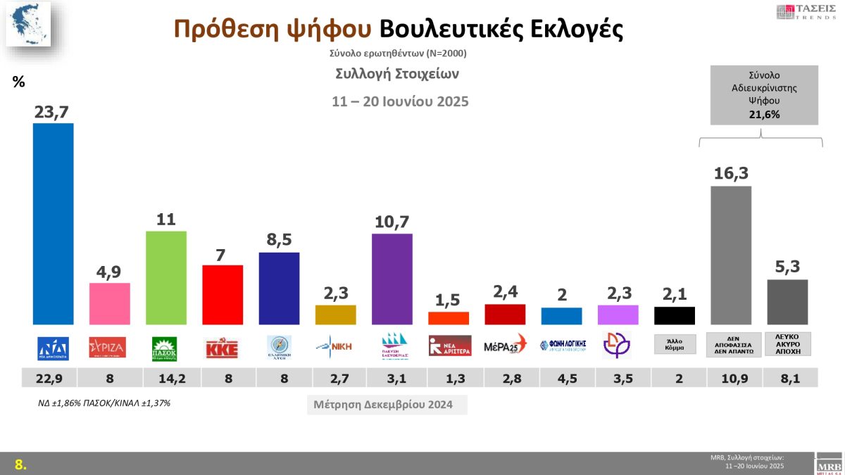 Στην πρόθεση ψήφου, η ΝΔ καταγράφει ποσοστό 23,7 % και ακολουθεί το ΠΑΣΟΚ με 11 %. Η Πλεύση Ελευθερίας συγκεντρώνει ποσοστό 10,7 %, η Ελληνική Λύση 8,5 %, το ΚΚΕ 7 %, ο ΣΥΡΙΖΑ-ΠΣ 4,9 %, το ΜεΡΑ25 2,4 %, το Κίνημα Δημοκρατίας 2,3 %, η Νίκη 2,3 %, και η Φωνή Λογικής 2 %.