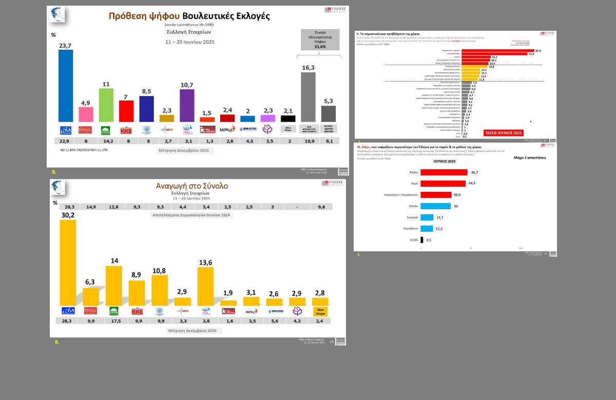 Στην πρόθεση ψήφου, η ΝΔ καταγράφει ποσοστό 23,7 % και ακολουθεί το ΠΑΣΟΚ με 11 %. Η Πλεύση Ελευθερίας συγκεντρώνει ποσοστό 10,7 %, η Ελληνική Λύση 8,5 %, το ΚΚΕ 7 %, ο ΣΥΡΙΖΑ-ΠΣ 4,9 %, το ΜεΡΑ25 2,4 %, το Κίνημα Δημοκρατίας 2,3 %, η Νίκη 2,3 %, και η Φωνή Λογικής 2 %.