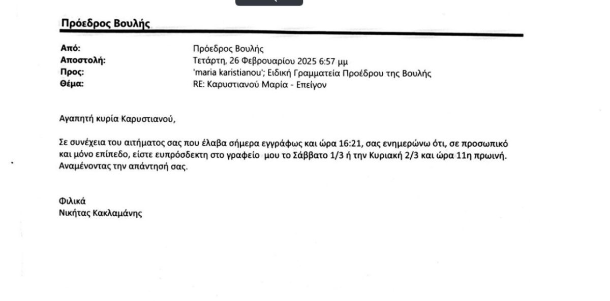 Ο Πρόεδρος της Βουλής πρόσθεσε ότι το μέιλ έχει αντιφάσεις καθώς όπως είπε όταν ζητάς ραντεβού σε κάποιον, δεν καθορίζεις εσύ το πότε θα γίνει η συνάντηση. «Η Μαρία Καρυστιανού θέλει να με δει αύριο στις 11.00. Επίσης επιμένει ότι επιβεβλημένη η παρουσία και της δικηγόρου της» συμπλήρωσε.