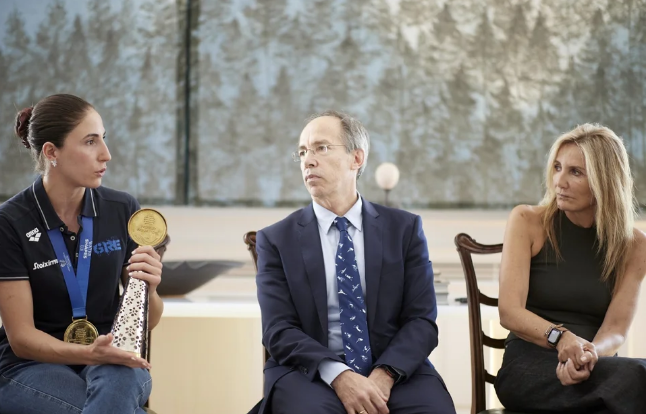 Ο πρωθυπουργός Κυριάκος Μητσοτάκης και η σύζυγός του Μαρέβα Γκραμπόφσκι-Μητσοτάκη υποδέχτηκαν σήμερα στο Μέγαρο Μαξίμου την εθνική ομάδα πόλο γυναικών, η οποία πριν λίγες ημέρες κατέκτησε το χρυσό μετάλλιο στο Παγκόσμιο Πρωτάθλημα στη Σιγκαπούρη.