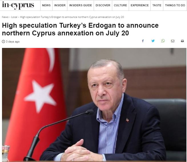 Aνησυχία προκαλούν οι φήμες ότι ο Ερντογάν είναι πιθανό να ανακοινώσει την προσάρτηση των Κατεχομένων στις 20 Ιουλίου, κάτι που αν κι εφόσον επιβεβαιωθεί θα πρόκειται για μια μια τεράστια πρόκληση από την Τουρκία που θα φέρει σφοδρές αντιδράσεις.