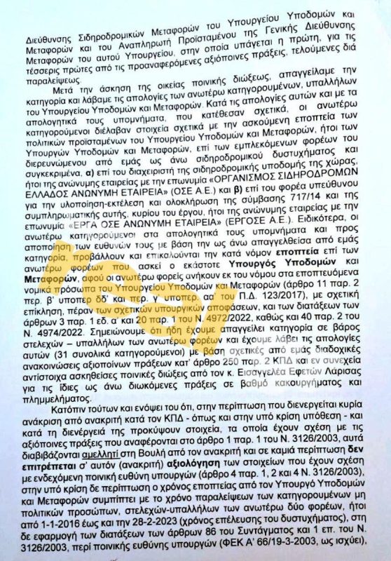 Στα πλαίσια της διενέργειας από εμάς κύριας ανακρίσεως, ζητήσαμε με σχετική ανακριτική μας πράξη, κατ’ άρθρο 250 παρ. 2 ΚΠΔ, προς τον κ. Εισαγγελέα Εφετών Λάρισας, την άσκηση ποινικής δίωξης σε βάρος της Προϊσταμένης της Διεύθυνσης Σιδηροδρομικών Μεταφορών του Υπουργείου Υποδομών και Μεταφορών και του Αναπληρωτή Προϊσταμένου της Γενικής Διεύθυνσης Μεταφορών του αυτού Υπουργείου, στην οποία υπάγεται η πρώτη, για τις τέσσερις πρώτες από τις προαναφερόμενες αξιόποινες πράξεις, τελούμενες διά παραλείψεως.