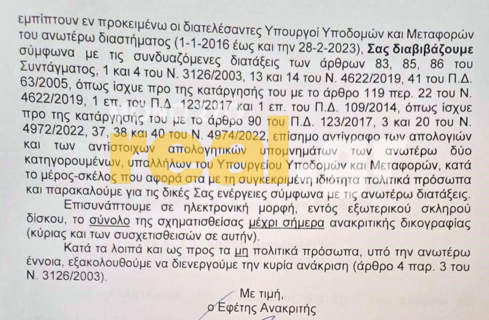 Κατόπιν τούτων και ενόψει του ότι, στην περίπτωση που διενεργείται κυρία ανάκριση από ανακριτή κατά τον ΚΠΔ – όπως και στην υπό κρίση υπόθεση – και κατά τη διενέργεια της προκύψουν στοιχεία, τα οποία έχουν σχέση με τις αξιόποινες πράξεις που αναφέρονται στο άρθρο 1 παρ. 1 του Ν. 3126/2003, αυτά διαβιβάζονται αμελλητί στη Βουλή από τον ανακριτή και σε καμία περίπτωση δεν επιτρέπεται σ’ αυτόν (ανακριτή) αξιολόγηση του κατά πόσο υφίσταται ενδεχόμενη ποινική ευθύνη υπουργών (άρθρο 4 παρ. 1, 2 και 4 Ν. 3126/2003), Σας διαβιβάζουμε σύμφωνα με τις συνδυασμένες διατάξεις των άρθρων 83, 85, 86 του Συντάγματος, 1 και 4 του Ν. 3126/2003, 13 και 14 του Ν. 4622/2019, 41 του Π.Δ. 63/2005, όπως ίσχυε προ της κατάργησής του με το άρθρο 119 περ. 22 του Ν. 4622/2019, 1 επ. του Π.Δ. 123/2017 και 1 επ. του Π.Δ. 109/2014, όπως ίσχυε προ της κατάργησής του με το άρθρο 90 του Π.Δ. 123/2017, 3 και 20 του Ν. 4972/2022, 37, 38 και 40 του Ν. 4974/2022, επίσημο αντίγραφο των απολογιών και των αντίστοιχων απολογητικών υπομνημάτων των ανωτέρω δύο κατηγορουμένων, υπαλλήλων του Υπουργείου Υποδομών και Μεταφορών, κατά το μέρος-σκέλος που αφορά στα με τη συγκεκριμένη ιδιότητα πολιτικά πρόσωπα και παρακαλούμε για τις δικές Σας ενέργειες σύμφωνα με τις ανωτέρω διατάξεις.