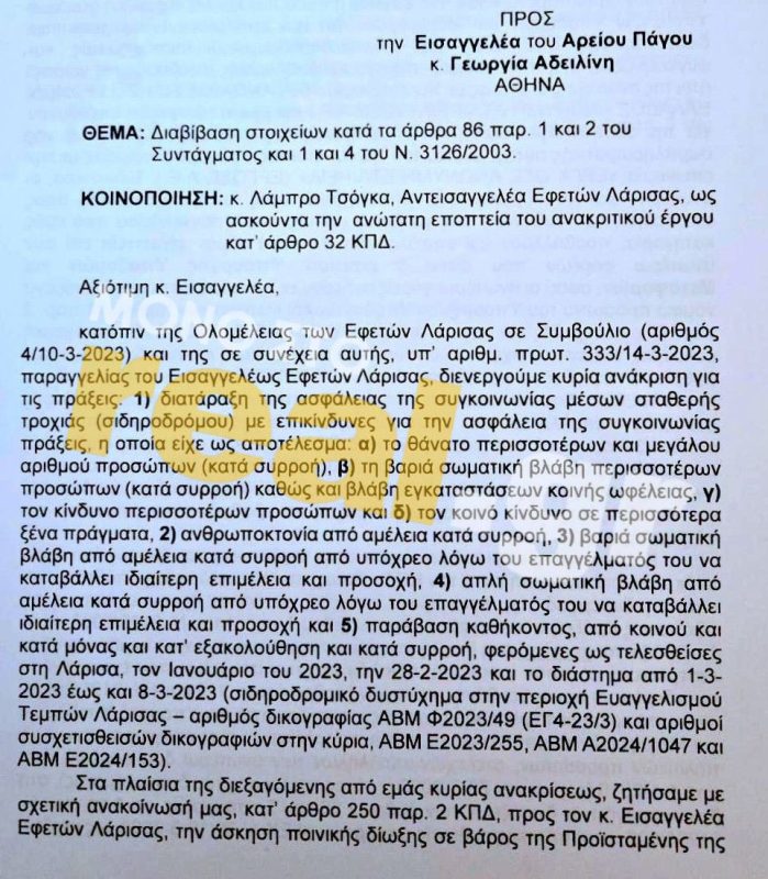 Κατόπιν της Ολομέλειας των Εφετών Λάρισας σε Συμβούλιο (αριθμός 4/10-3-2023) και της σε συνέχεια αυτής, υπ’ αριθμ. πρωτ. 333/14-3-2023, παραγγελίας του Εισαγγελέως Εφετών Λάρισας, διενεργούμε κυρία ανάκριση για τις πράξεις: