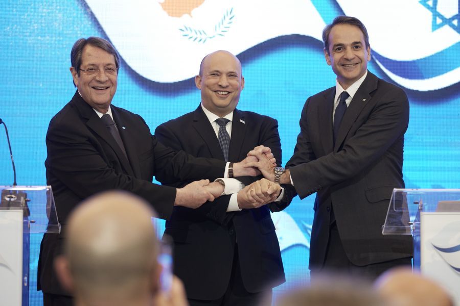 «Εμείς, ο Naftali Bennett, Πρωθυπουργός του Κράτους του Ισραήλ, ο Κυριάκος Μητσοτάκης, Πρωθυπουργός της Ελληνικής Δημοκρατίας, και ο Νίκος Αναστασιάδης, Πρόεδρος της Κυπριακής Δημοκρατίας, συναντώμενοι στην Ιερουσαλήμ σήμερα, 7η Δεκεμβρίου 2021, συμφωνήσαμε να ενισχύσουμε την συνεργασία μεταξύ των χωρών μας, για να προωθήσουμε κοινά συμφέροντα και να εργαστούμε από κοινού για την ειρήνη, τη σταθερότητα, την ασφάλεια και την ευημερία των εθνών μας, στη Μεσόγειο και την ευρύτερη περιοχή.
