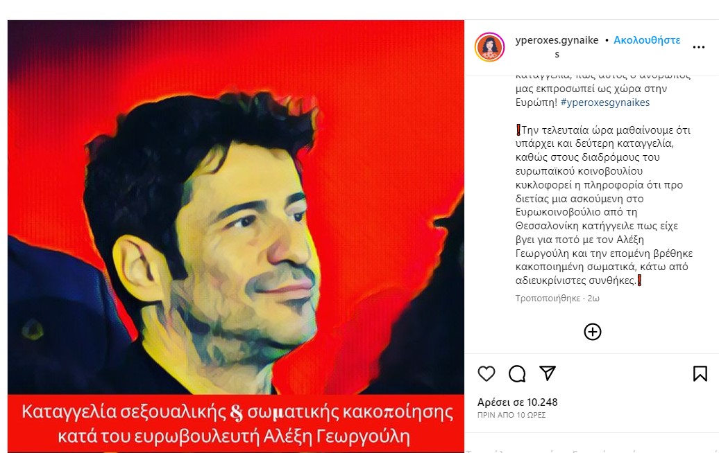 «Την τελευταία ώρα μαθαίνουμε ότι υπάρχει και δεύτερη καταγγελία, καθώς στους διαδρόμους του ευρωπαϊκού κοινοβουλίου κυκλοφορεί η πληροφορία ότι προ διετίας μια ασκούμενη στο Ευρωκοινοβούλιο από τη Θεσσαλονίκη κατήγγειλε πως είχε βγει για ποτό με τον Αλέξη Γεωργούλη και την επομένη βρέθηκε κακοποιημένη σωματικά, κάτω από αδιευκρίνιστες συνθήκες», αναφέρεται στην ανάρτηση της σελίδας «Υπέροχες Γυναίκες».