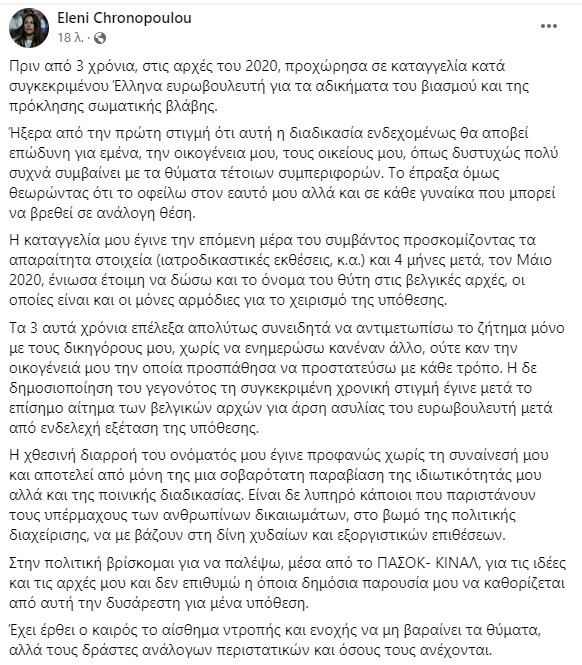 «Πριν από 3 χρόνια, στις αρχές του 2020, προχώρησα σε καταγγελία κατά συγκεκριμένου Έλληνα ευρωβουλευτή για τα αδικήματα του βιασμού και της πρόκλησης σωματικής βλάβης» σημειώνει.
