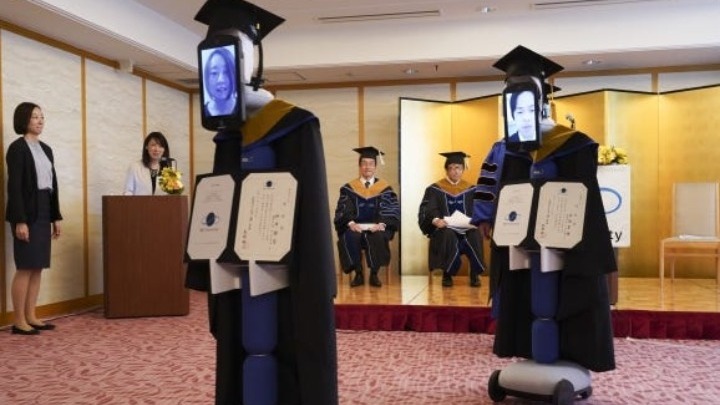 Υποχρεώθηκαν να χρησιμοποιήσουν τηλεχειριζόμενα ρομπότ για μία εικονική αποφοίτηση. Οι φοιτητές επικοινωνούσαν με την τελετή μέσω του Zoom, του γνωστού εργαλείου για τηλε-διασκέψεις, για να εμφανίσουν το πρόσωπό τους στις οθόνες.